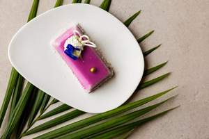 a pink cake on a plate with palm leavesImage Image2, Link to Larger Image, a pink cake on a plate with palm leaves