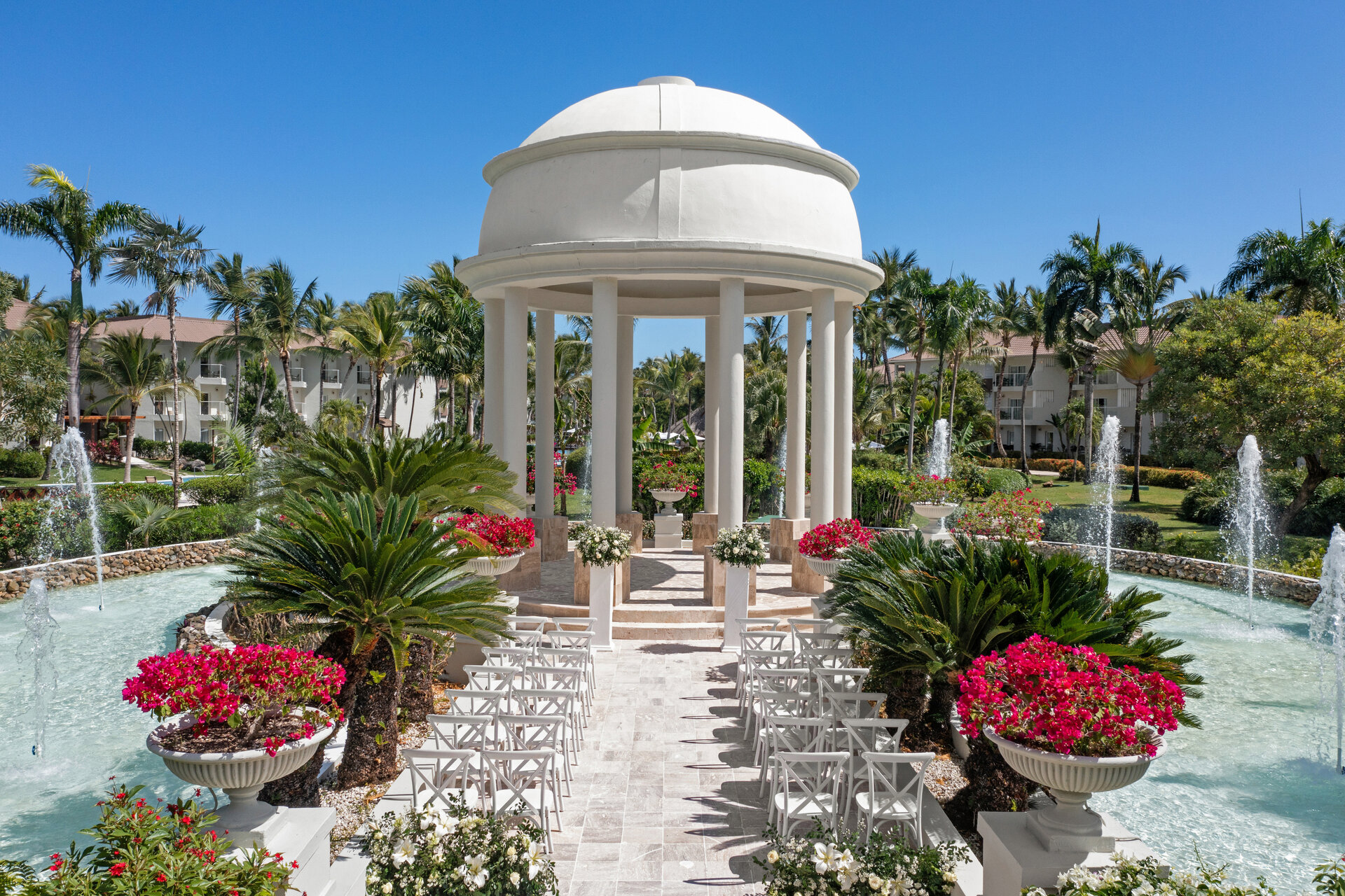 a white gazebo with chairs and flowers in front of a fountainLink to Larger Item Photo, ListItemCarouselImage1